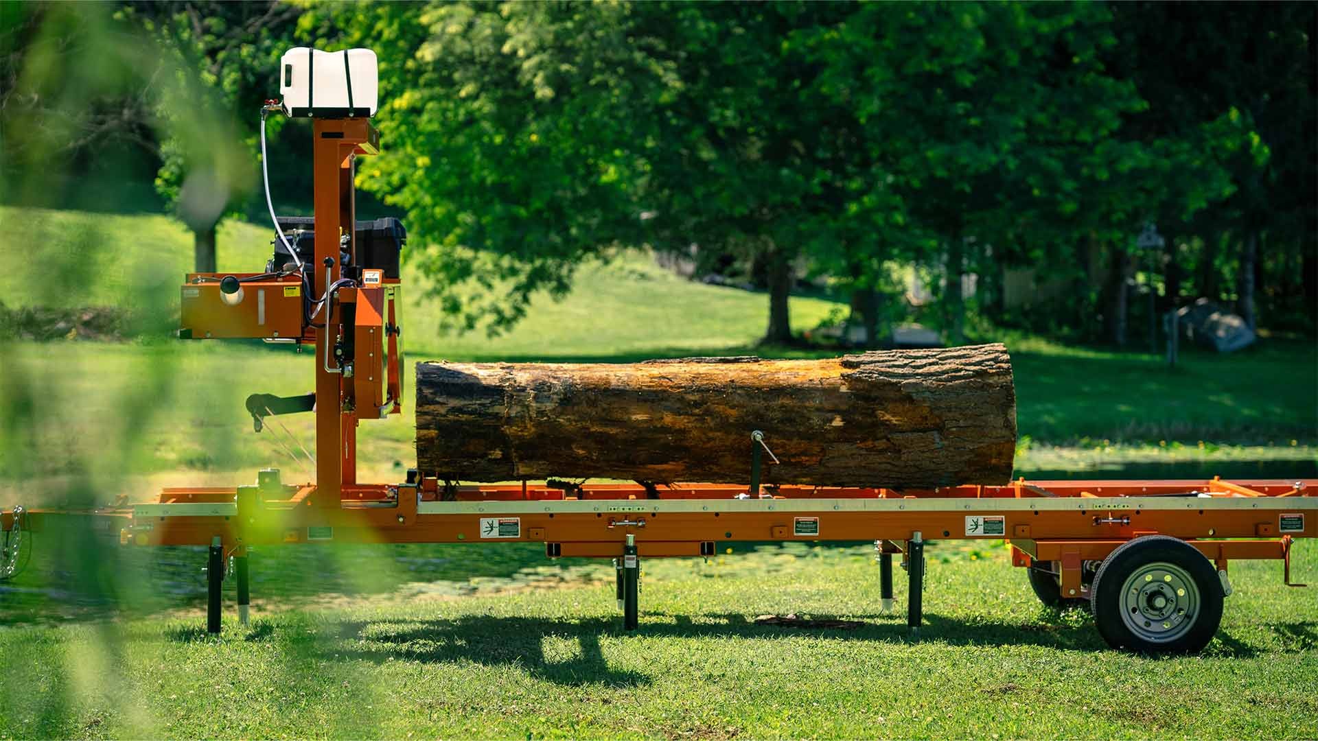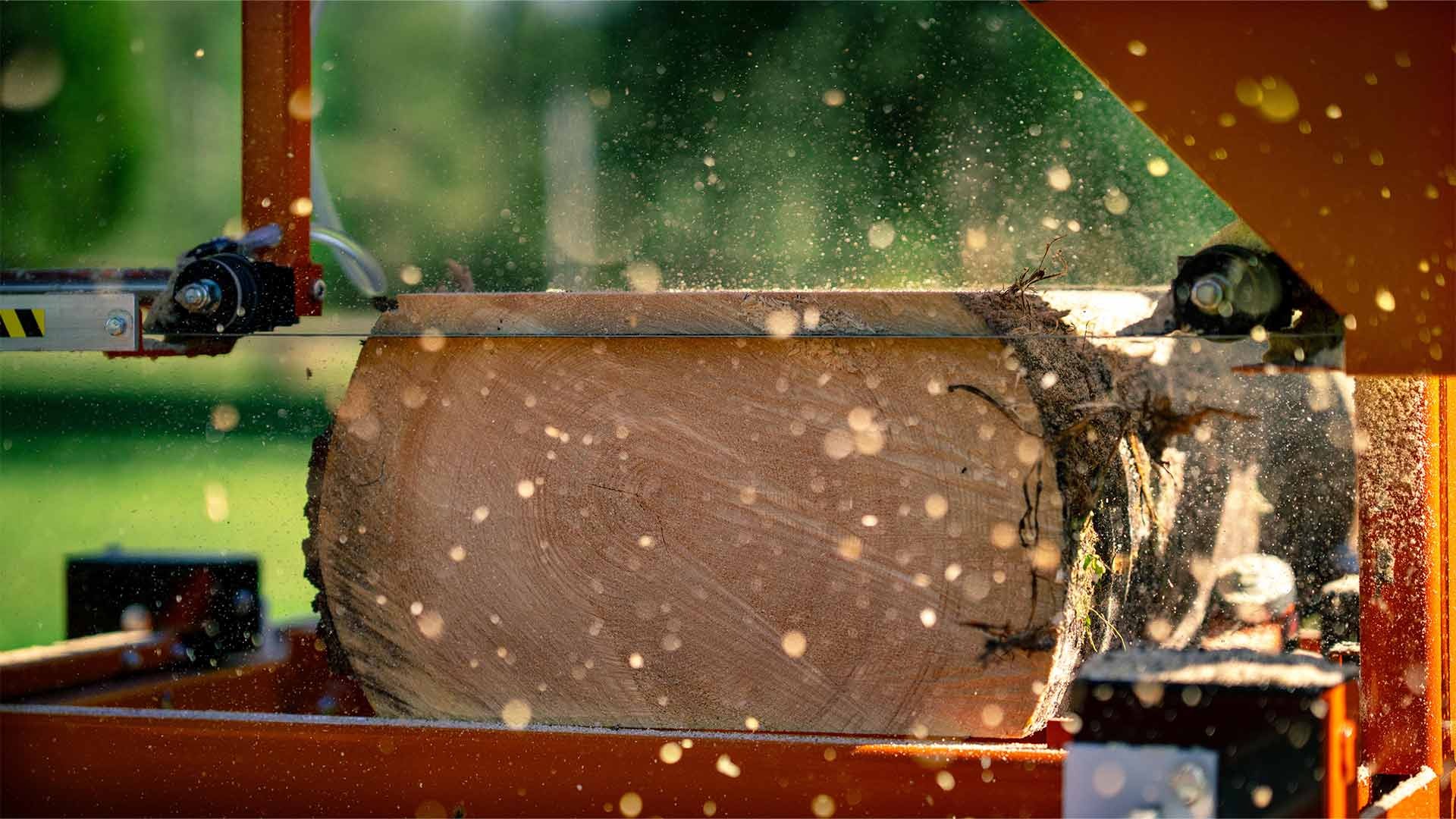 Chargées et tournées manuellement avec un crochet tourne-billes, les billes sont maintenues sur le banc par six supports latéraux renforcés, avec des rouleaux robustes pour aider à tourner les billes, et deux dispositifs de serrage de billes entièrement réglables qui viennent serrer fermement la bille pour permettre des coupes à 2,5 cm du banc. Pour préparer la coupe, la hauteur de tête est réglée avec précision par un tour rapide de la manivelle de montée/descente et la lame est embrayée facilement avec une poignée. La coupe se fait en faisant avancer de façon continue la tête de la scierie le long de la longueur de la bille en tournant un système d’avance, nécessitant peu de maintenance, installé sur une corde au lieu d’un câble. Une avance mécanique est disponible en option facultative. Une fois la coupe terminée, la tête est relevée, ramenée en arrière et abaissée en position pour la prochaine coupe. Un réservoir d’eau alimente la lubrification directement sur la lame pour améliorer les performances de coupe et maintenir la lame propre. Le bras guide-lame réglable maintient la lame pendant la coupe de bois de différentes dimensions. La tension de la lame se règle facilement et maintient la lame à la bonne tension pour la coupe.